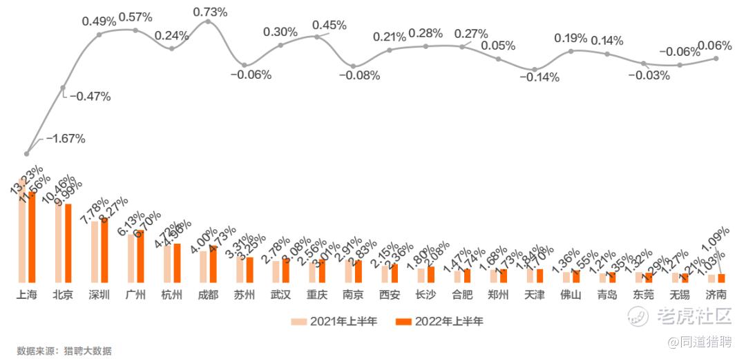 ▌ 2022H1全国青年人才投递城市排名TOP20及其占比变化