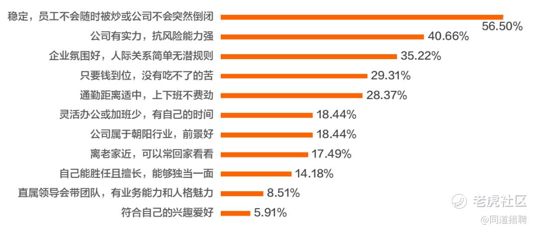 寻求安全感表现在具体的择业行为中就是求稳。猎聘调研发现,在当前形势下,青年人才看重的就业因素是“稳定,员工不会随时被炒或公司不会突然倒闭”,该项得票率为56.50%。“公司有实力,抗风险能力强”得票率为40.66%,位居第二。排在最后的择业因素是“符合自己的兴趣爱好”,得票率仅为5.91%。由此可见,当下青年人才择业更加理性、务实,稳定性成为压倒一切的考虑因素,而一些感性因素如“符合自己的兴趣爱好”几乎被忽略。