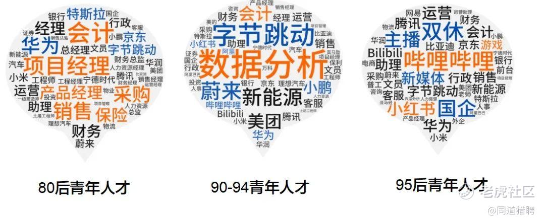 从 80 后、90-94、95 后求职者搜索关键词来看,80 后搜索的关键词集中于传统类岗位,如会计、项目经理、采购等;90-94 年出生的求职者搜索的关键词集中在新兴公司如字节跳动、蔚来和美团;而 95 后求职搜索词出现两极分化的趋势:一方面作为互联网原住民,他们崇尚个性,体现在他们关注新型社交平台(如 B 站)和社交媒体相关岗位;同时他们具有较强的劳动维权意识,关心自己双休的权益;另一方面,在当前形势下,一些 95 后求稳的求职心态与整体职场人一致,体现在搜索关键词中,“国企”出现的频率较高。