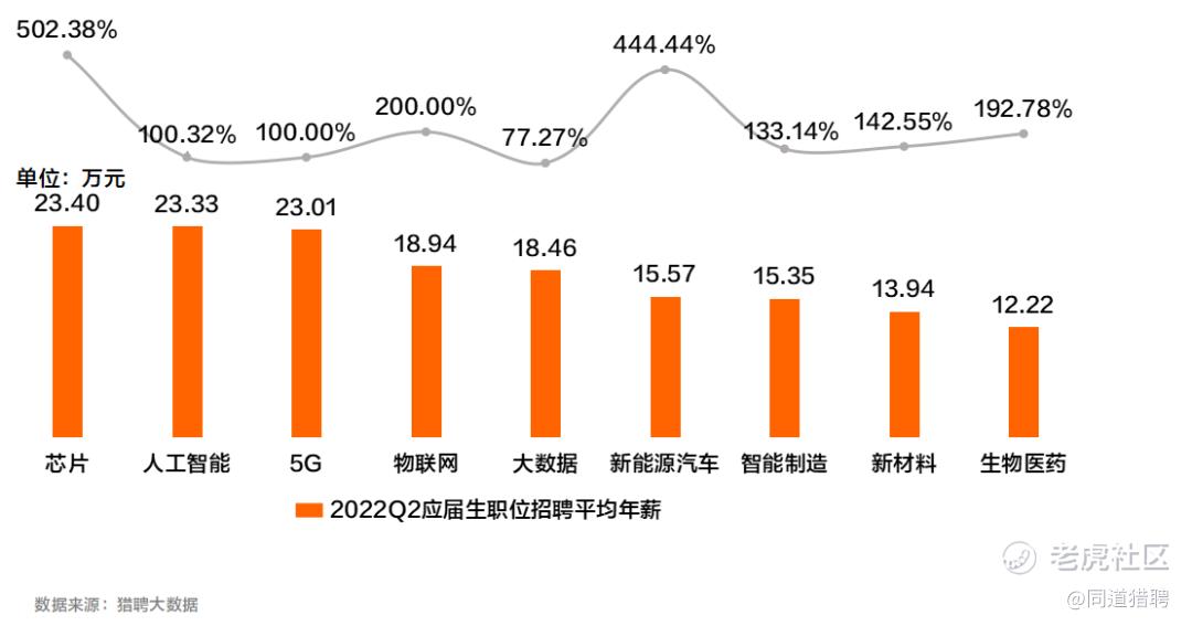 在国家重点发展的新兴领域中,今年二季度新发应届生职位同比增长最高的是芯片领域,增幅为 502.38%;新能源汽车、物联网增幅位居第二、第三,分别为 444.44%、200.00%。生物医药、新材料、智能制造、人工智能、5G 应届生职位增幅均为 100%及以上。从这些新兴领域应届生招聘平均年薪来看,芯片、人工智能、5G 位居前三,为 23.40 万、23.33 万、23.01 万,高技术门槛对应的是优厚的薪资待遇。