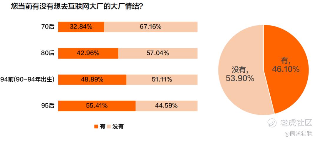 猎聘调研发现,53.90%的职场人有大厂情结。分代际来看,越年轻的代际大厂情结越浓,其中 95 后的大厂情结最浓,有大厂的情结的 95 后占到该代际的 55.41%。虽然在当前形势下,互联网大厂受到疫情和整体行业的影响,但它们所代表的创富能力、创新思维依然对青年人才有着较强的号召力。