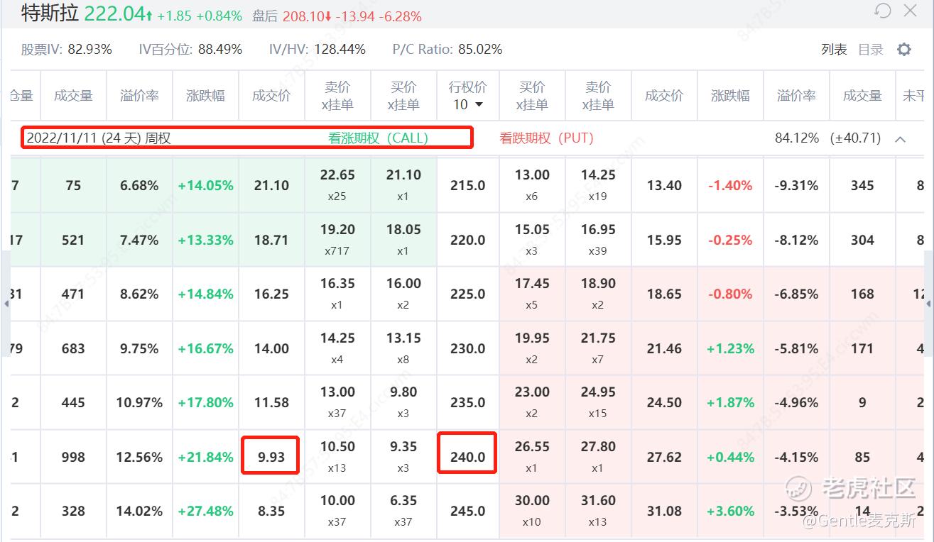 上面是2022年11月11日到期的期权链, 从红色圈出部分,可以看到,行权价格为240的看涨期权成交价为9.93.