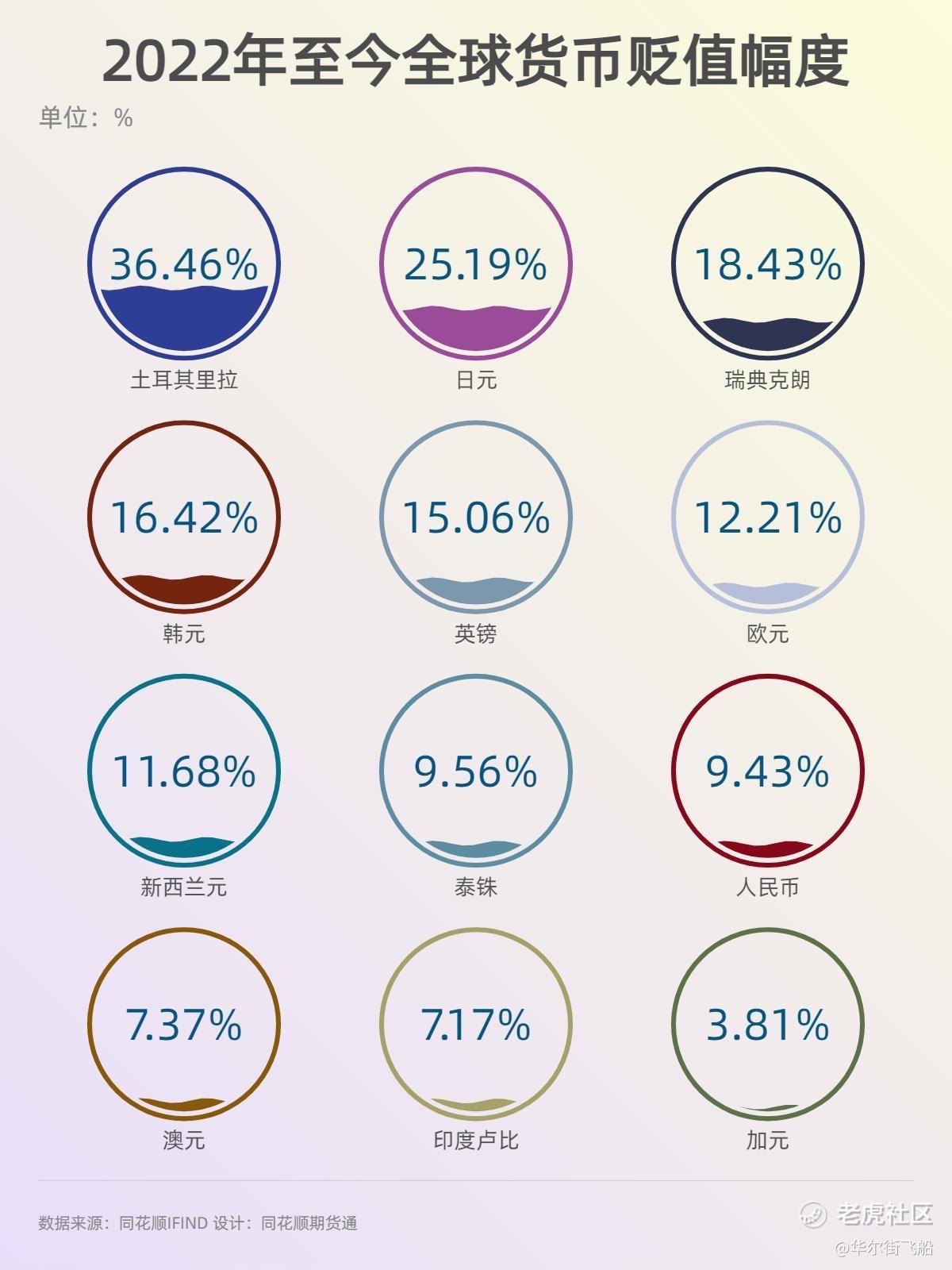 在强势美元之下,全球多国货币出现了大幅度贬值。据同花顺IFIND数据显示,年初至今,土耳其里拉以36.46%的贬值幅度位居榜首,日元、瑞典克朗及韩元等贬值幅度均超18%,而人民币、印度卢比等货币贬值幅度则均低于10%。