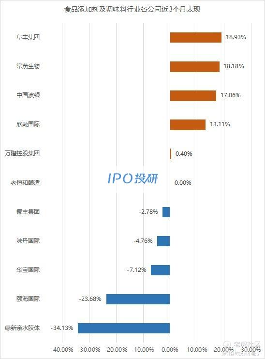 近3个月涨幅最大的是阜丰集团(00546.HK),涨幅为18.93%;跌幅最大的是绿新亲水胶体(01084.HK),跌幅为-34.13%。