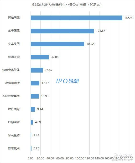 3、市值最高的是颐海国际(01579.HK),市值为186.98亿元;市值最低的是椰丰集团(01695.HK),市值为0.76亿元。