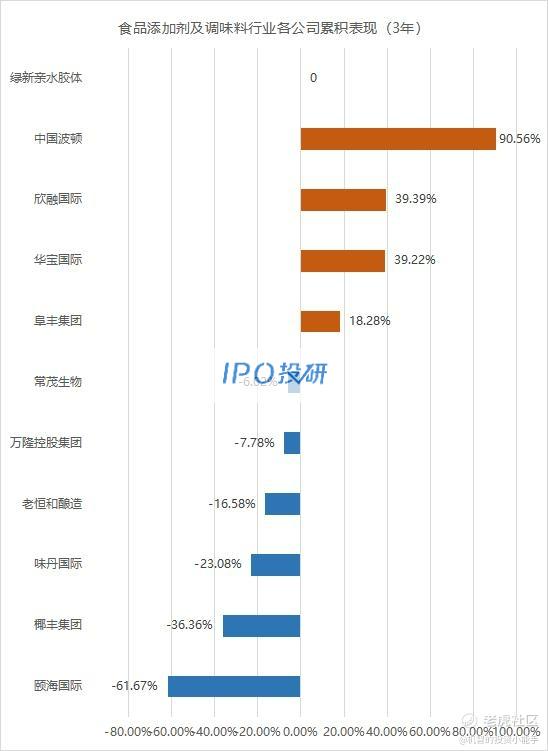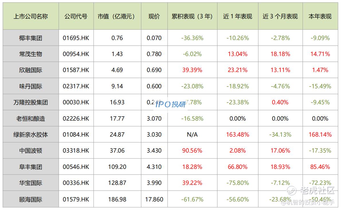 累计表现涨幅最大的是中国波顿(03318.HK),涨幅为90.56%;跌幅最大的是颐海国际(01579.HK),跌幅为-61.67%。