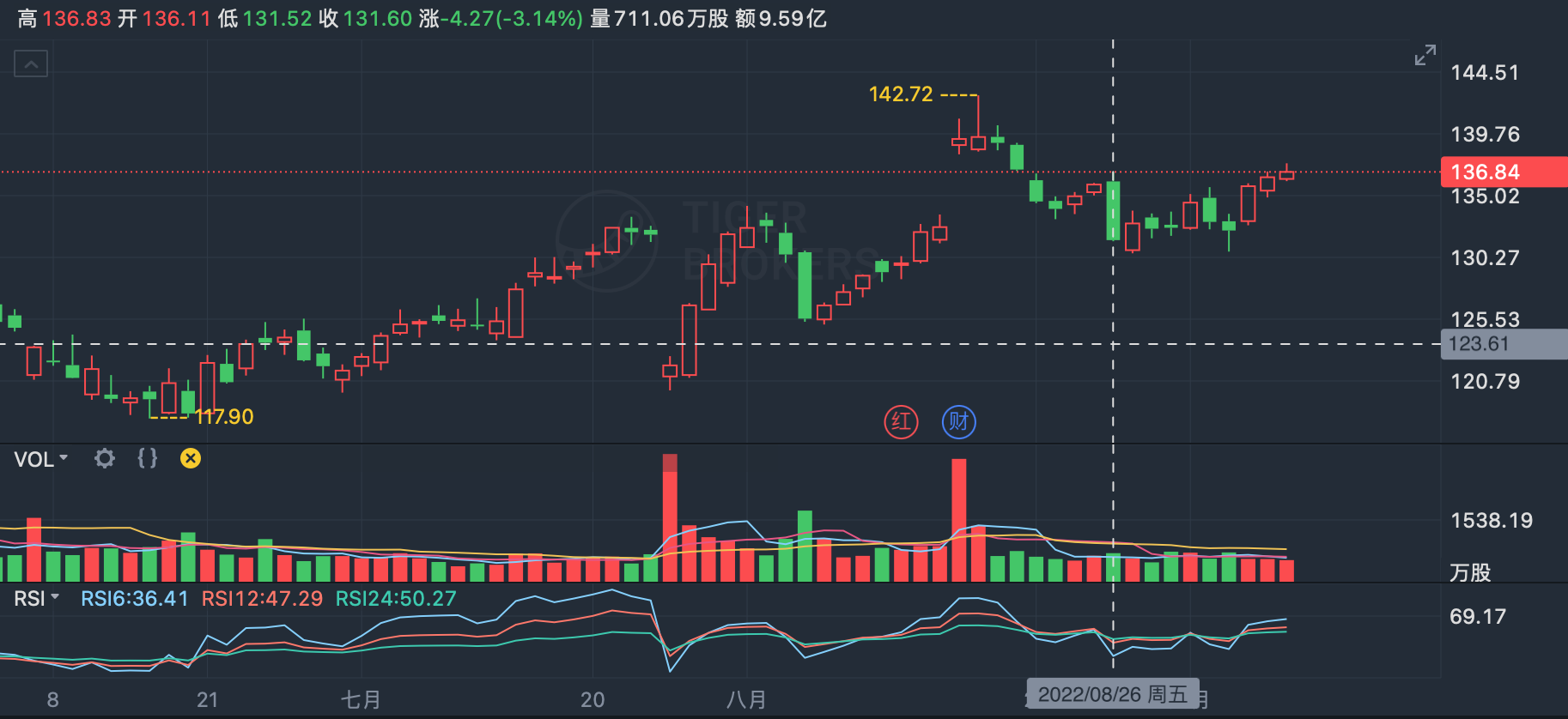 1.厘定日期、蜡烛图形态和价格。8月17日(周三)股价为142.72美元。8月16日蜡烛图显示,当日股价从8月15日收盘价132.6美元向上跳空高开138.9美元,收盘价为139.37美元;8月17日开盘价138.57美元,收盘价139.52美元。8月18日股价开始进入下跌趋势,直到8月26日。