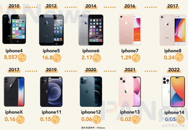 来看看历届iPhone需要多少个大饼,iPhone14只需要0.05个。
