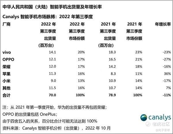 没有人怀疑行业正在过冬——包括该季度市场份额唯一增长的苹果。由于整体市场疲软,国内手机厂商荣米OV的出货量同比去年皆有一定程度的下滑,只有苹果出货量从去年第三季度的830万台大增36%至今年第三季度的1130万台。