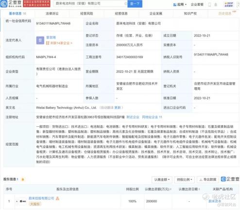 工商信息显示,蔚来电池科技经营范围涉及电池制造;电池销售;电子专用材料研发;电子专用材料销售;电子专用材料制造;石墨及碳素制品销售;新型膜材料销售;塑料制品制造;塑料制品销售;高纯元素及化合物销售;石墨及碳素制品制造;汽车零部件及配件制造;新能源汽车电附件销售等。