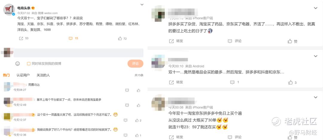 目前,很多消费者已经能根据平台特性做出差异化的选择。微博上就有网友表示,今年在拼多多买了杂货,淘宝买了药品,京东买了电器;还有网友称今年是“雨露均沾”“唯品会买的最多,然后淘宝、拼多多、抖音和京东”。
