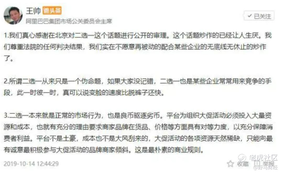 2019年双11前夕,阿里集团市场公关委员会主席王帅曾在微博为“二选一”站台,称其是正常的市场行为、最朴素的商业规则;话音刚落,京东便回怼称,“涸泽而渔的结果是让天下的生意越来越难”;随后,拼多多高层也加入战局,并毫不避讳地指控阿里倚强凌弱,让消费者和商家蒙受损失。