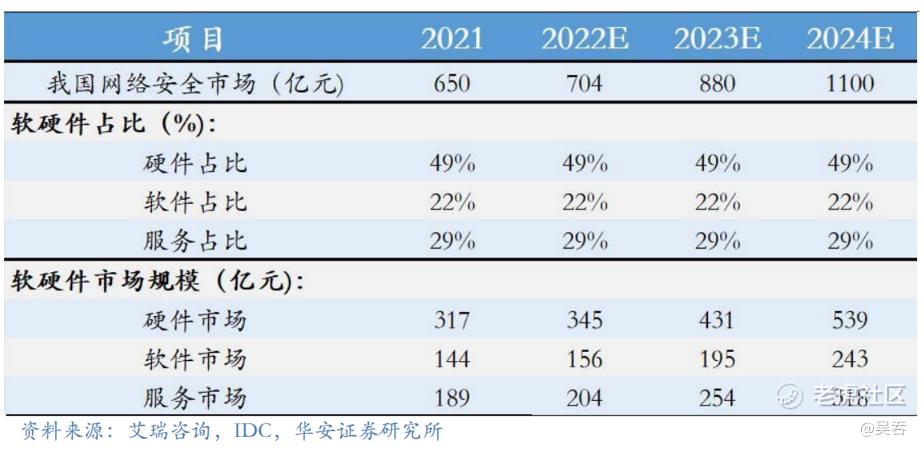 硬件长期占据了网安产业的半壁江山,据艾瑞咨询及IDC数据,2021年硬件产品占整个网安产业产品的49%,并且预计将在未来数年保持这一比例。网络安全硬件市场规模也是接近软件市场规模与服务市场规模之和。