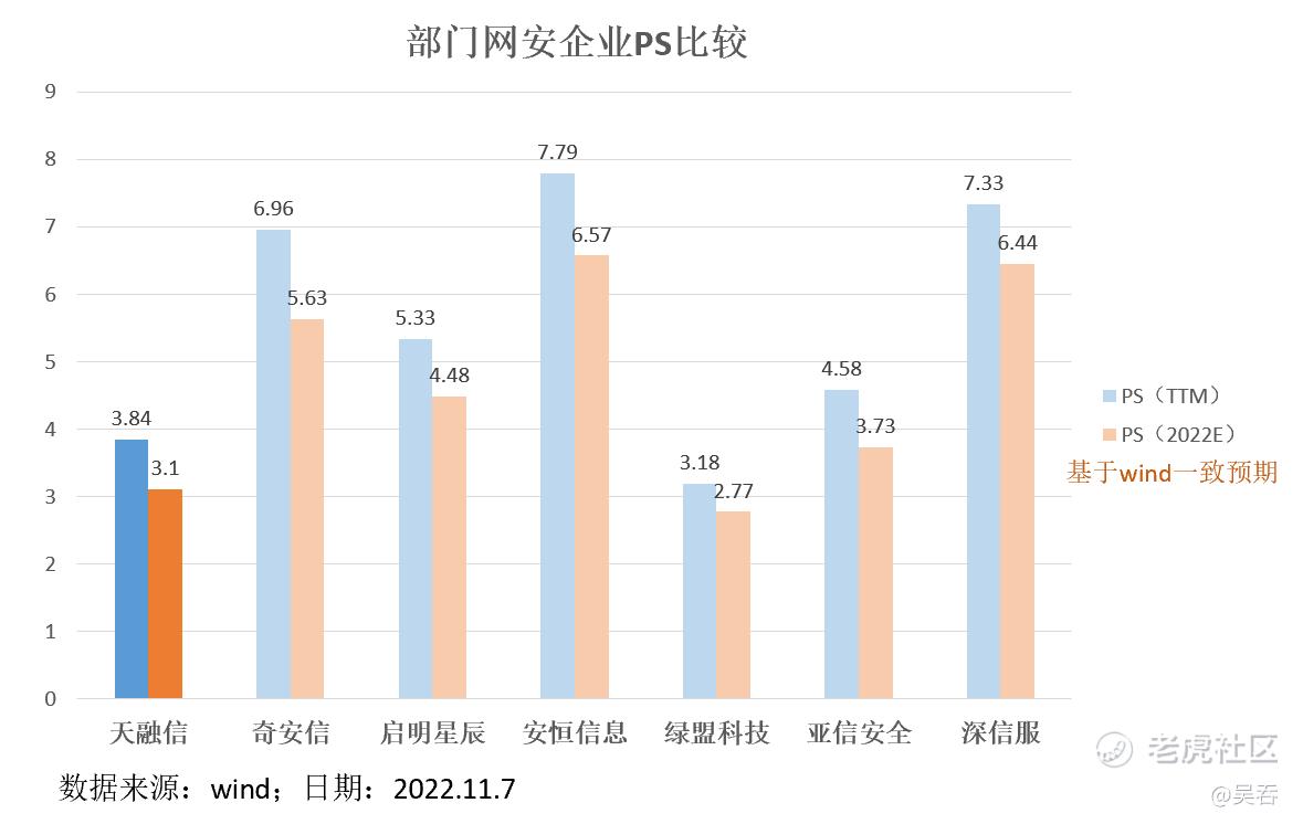 从PS值来看,无论是PS(TTM)还是PS(2022E)天融信的估值显著低于可比公司平均水平。