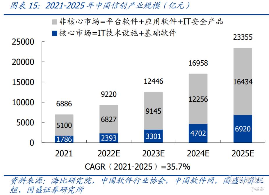 除了云计算行业是一片蓝海外,伴随着国家持续加大对科技创新的支持力度,信创产业已上升至国家战略层面。《“十四五”国家信息化规划》明确 2022~2025 年将开启 新一轮数字经济建设周期,信创产品作为数字经济核心环节将直接受益。根据海比研究院预测,中国信创产业规模在2021-2025年CAGR为35.7%。