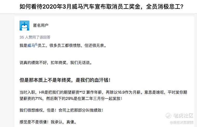 实际上,此次降薪并非首次。早在两年前,就有威马汽车员工在知乎等社交平台上透露,威马汽车以“卖车不多”为由,扣发了许多员工25%的年终奖。此外,为了逃避员工仲裁,威马汽车特别将这部分年终奖称作“绩效”,也就是发放数额与公司效益及员工表现密切相关,即使公司借故不发,员工也难以维权。