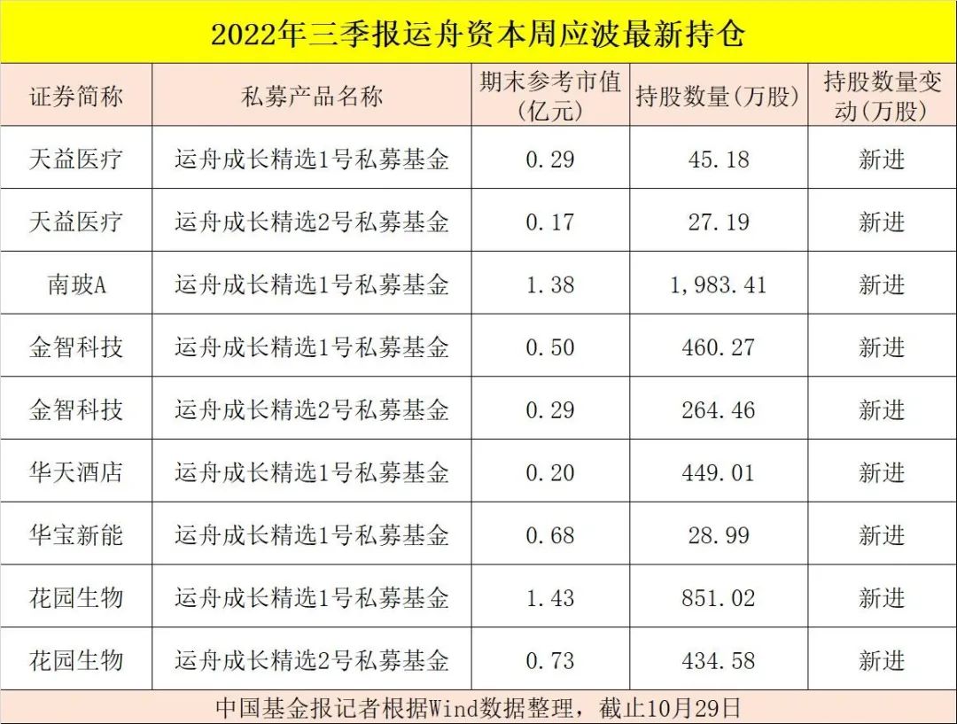 今年知名基金经理周应波“公奔私”,创立了运舟资本,9月他的首批新产品进入建仓期,最新持股曝光了。截止10月29日,周应波管理的运舟成长精选1号、2号私募基金总共现身6家上市公司的前十大流通股东名单中,但总体持股市值仅5.67亿元。