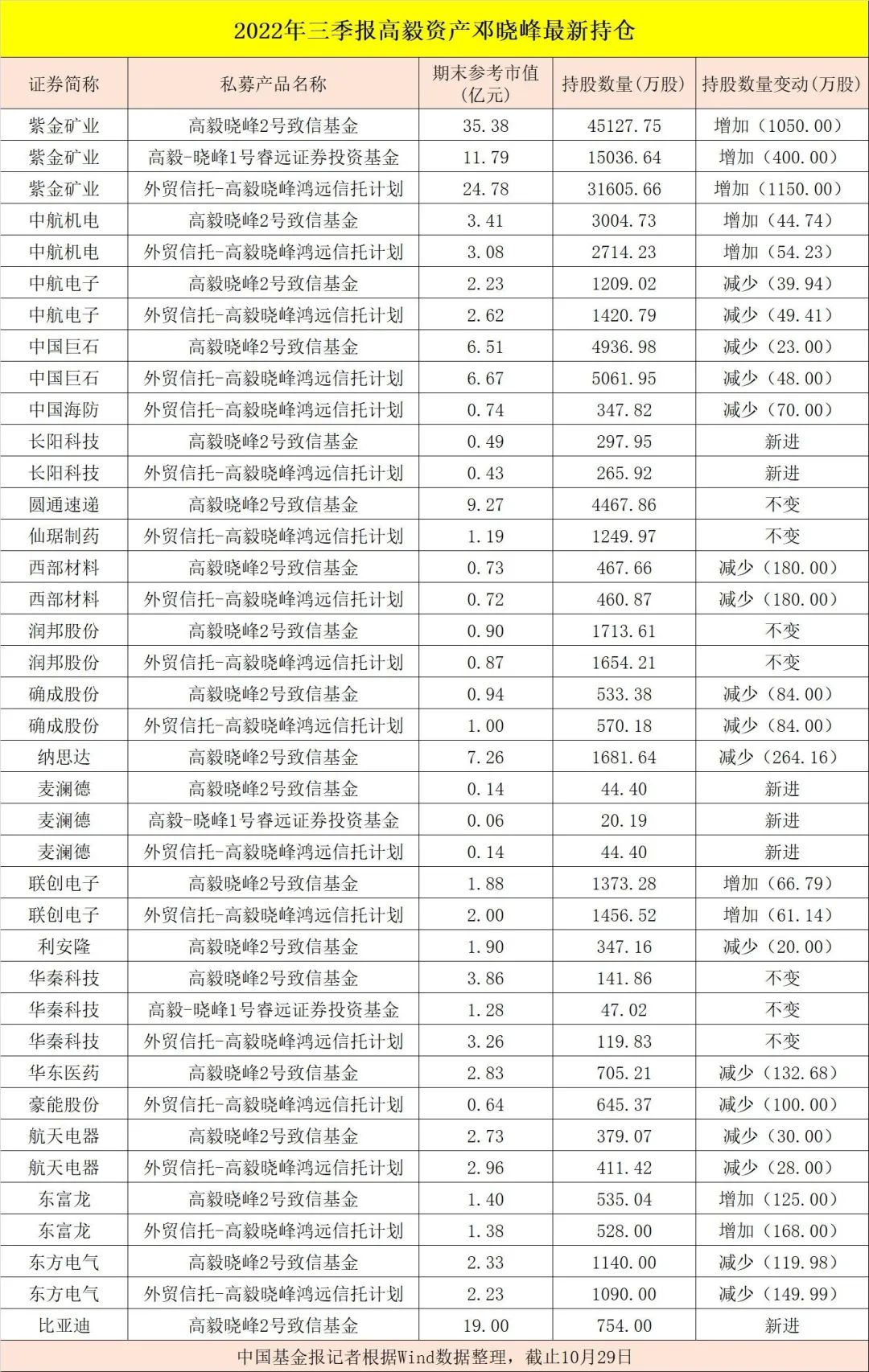 高毅资产首席投资官邓晓峰今年三季度逆势积极布局,截止10月29日,他管理的几只产品总共现身了22家上市公司的前十大流通股东名单,合计持有市值超171亿元。