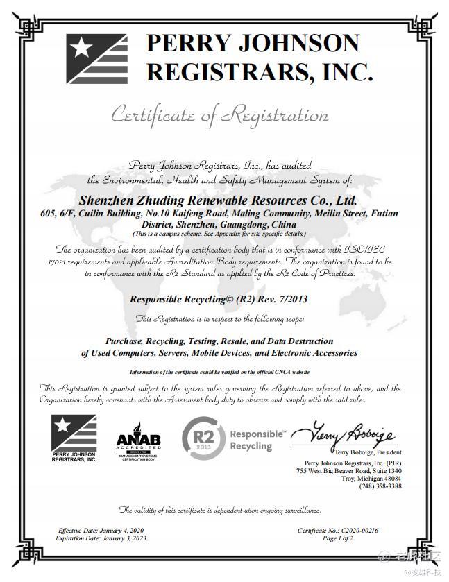 R2是Responsible Recycling的缩写,意为负责任回收,是美国环境保护署(EPA)与电子回收行业共同制定的电子回收行业标准,为目前回收行业通用的最高国际标准。R2标准正式颁布实施以来,世界各地的电子回收组织开始申请R2认证。