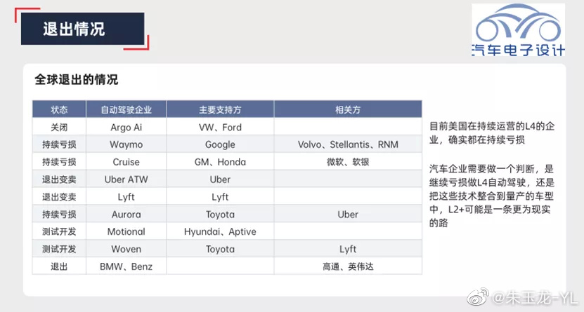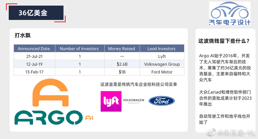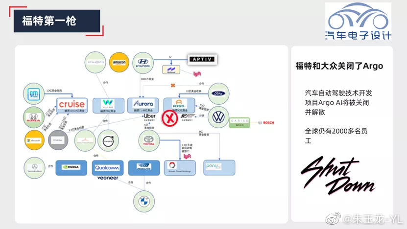 在美股回调以后,整个L4自动驾驶企业的出路。好嘛,福特立马开了第一枪——福特与大众联合投资的自动驾驶技术项目Argo AI将被关闭并解散。这家由谷歌和Waymo前工程师Bryan Salesky领导的初创公司,解散通知给到了2000名员工,将为其中一些人提供在这两家汽车制造公司中工作的机会。$福特汽车(F)$ $谷歌(GOOG)$ $谷歌A(GOOGL)$