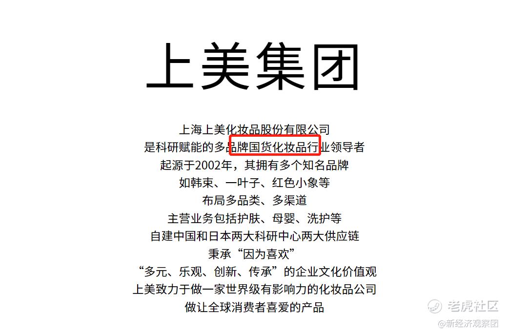 在招股书的自我介绍里,上美集团自称为“一家领先的多品牌国货化妆品公司”,“国货”两个字更是出现了71次。同时,在官方网站的简介里,上美集团则自称为“是科研赋能的多品牌国货化妆品行业领导者”。