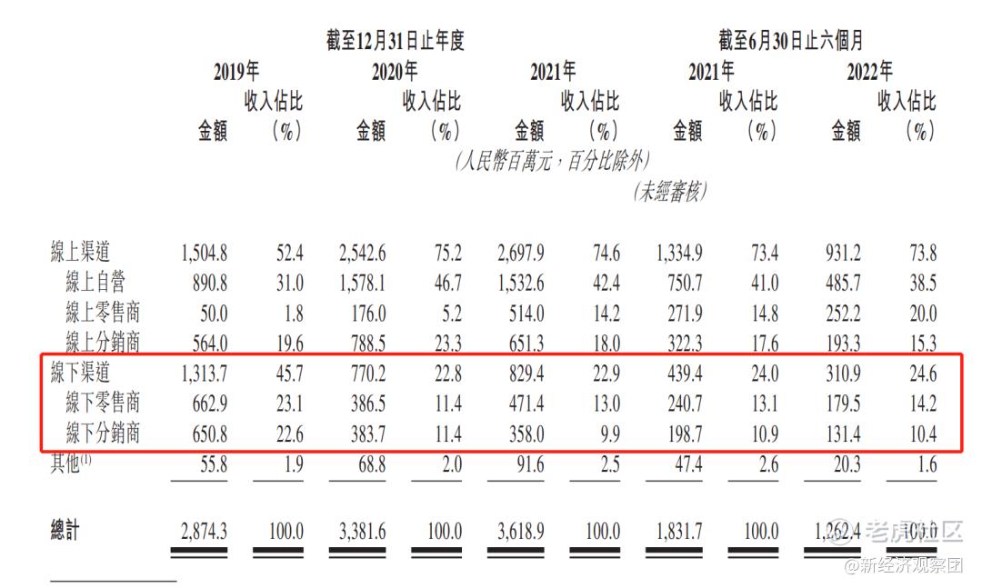而在招股书内,线下渠道在营收中的占比从2019年的45.7%,下降至2022年上半年的24.6%。