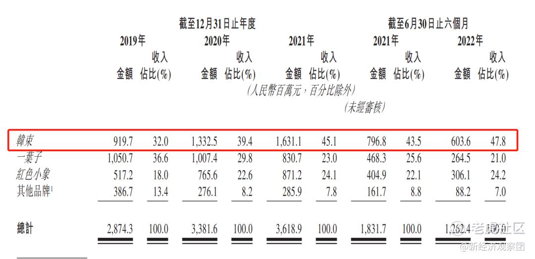 2019年-2022年上半年,上美集团收入分别为28.74亿元、33.82亿元、36.19亿元和12.62亿元,韩束、一叶子与红色小象三大品牌占总营收的比重一直在90%左右,2022年上半年占比达到93%,其他品牌收入缩水到7%。而拳头品牌韩束对收入的贡献更是逐年上涨,报告期内对营收的贡献分别为32%、39.4%、45.1和47.8%,接近半壁江山。而在2019年曾一度贡献36.6%营收一叶子,到2022年上半年已下降到21%,降幅超过15个百分点。