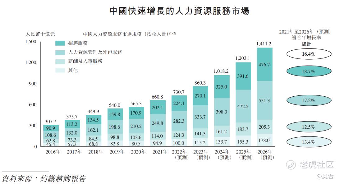 据灼识咨询数据,2021年中国人力资源服务行业市场规模按收入计达到6608亿元,预计到2026年有望增长至14,112亿元,2021-2026年 CAGR(复合年增长率)为16.4%。2021年,中国人力资源服务市场规模占名义国内生产总值的百分比为0.6%,低于英国的 1.8%、日本的1.7%及美国的0.9%,具备较大市场潜力。