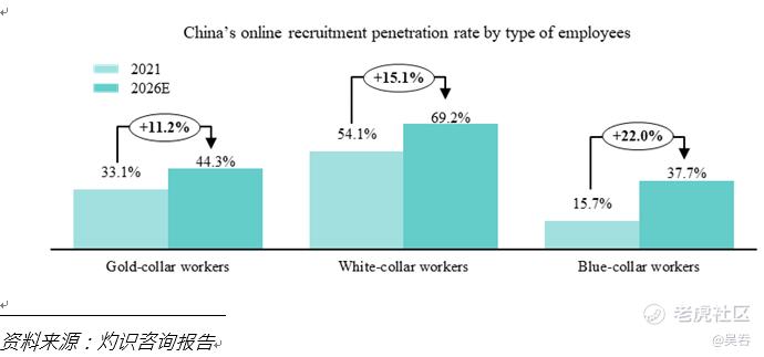 因此在蓝白金人群中,尤其蓝领人群线上招聘渗透率低,拉低了整体值。灼识咨询报告显示,2021年中国蓝领工人达到3.95亿人,但线上招聘渗透率仅有15.7%,较白领和金领有较大提升空间。