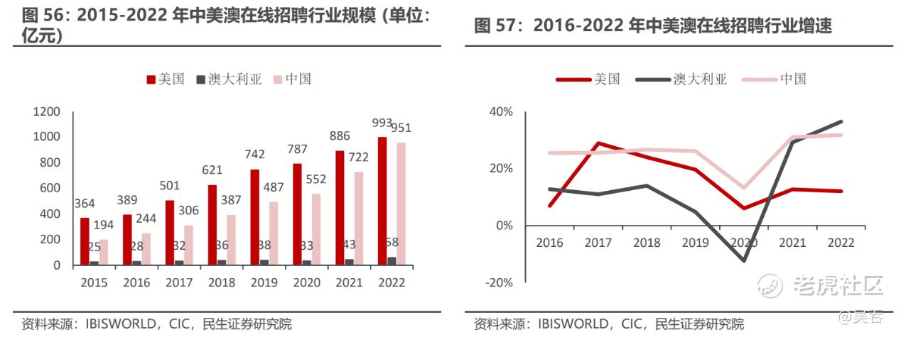对比在线招聘产业发展相对完善的美国与澳大利亚,近年我国在线招聘市场增速明显更快。根据民生证券的预测,以中国、美国在线招聘市场历史CAGR测算,中国整体市场规模收入预计将于2023年超过美国。值得一提的是,中国劳动力人口约美国的5倍,行业天花板还远未达到。