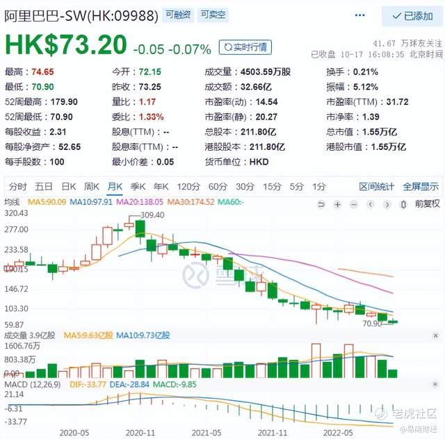 截至10月14日报盘,阿里美股报73.02美元/股,仅略高于发行价。其市值更是从历史最高点6万亿元,跌至1.4万亿元,蒸发77%。