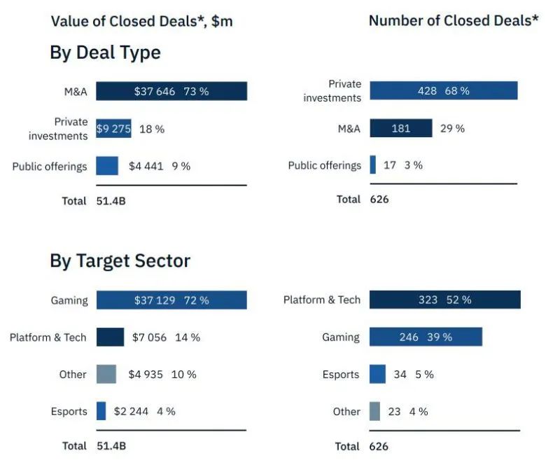 全年战略投资的交易额创下了新的记录,达到1014亿美元(21年第一季度至第三季度为234亿美元),而已完成的交易总数大跌40%,从21年前三季度的134笔交易减少到全年只有81笔。Embracer公司以22笔交易位居第一,总金额为38亿美元。