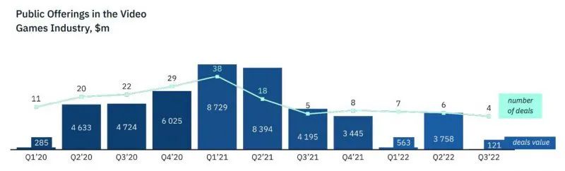 虽然22年第三季度整个游戏市场活动都出现了投资活动的疲软,但公开募股的跌幅是其中最大的,甚至下探到了2020年初以来的最低点。在全年的基础上,总交易额与2021年相比缩水了80%,与2020年相比缩水了50%;同时,交易数量与2021年相比下降了3.6倍,与2020年相比下降了3倍,这也使2022年成为公开募股的最差年份。