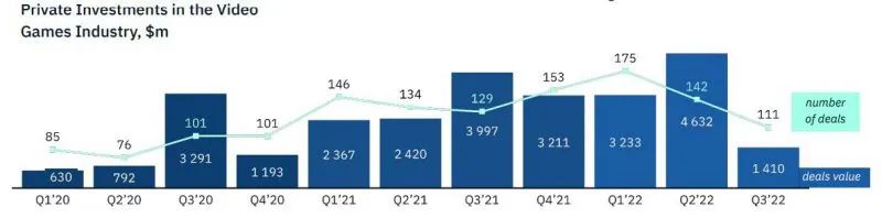事实证明,22年第三季度延续了上一季度疲软的表现,游戏市场的冷却因素进一步恶化:疲软的宏观经济形势、后疫情时代的用户参与度下降、苹果IDFA政策压力、监管审查的增加、游戏发售的延期、供应链问题以及其他因素。本季度,所有的投资活动类型都出现了萎缩。