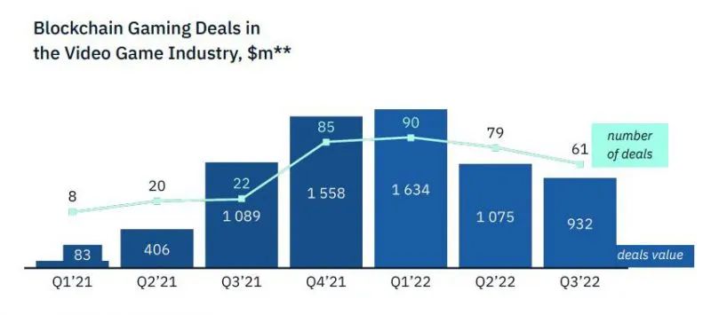 在区块链和web 3.0领域,尽管区块链游戏曾经是早期投资活动的驱动力,但在刚刚过去的第三季度,区块链相关投资首次出现出现负增长指标:尽管交易总数继续增长(同比增长2.8倍;61笔&22笔),但交易总额同比下降-14%(9.32亿美元比10.9亿美元)。