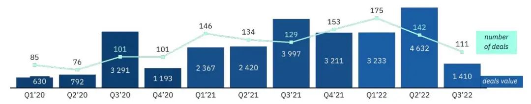 宏观经济形势的恶化似乎也最终影响到了私人投资:第三季度创下了自2020年第四季度以来的最弱表现。111项交易披露的总价值为14亿美元,与22年第二季度相比大幅下降(环比下降69%)。第三季度仍有一些重磅交易未被披露的可能性,但交易数量的下降和普遍的经济萧条表明情况并非如此。