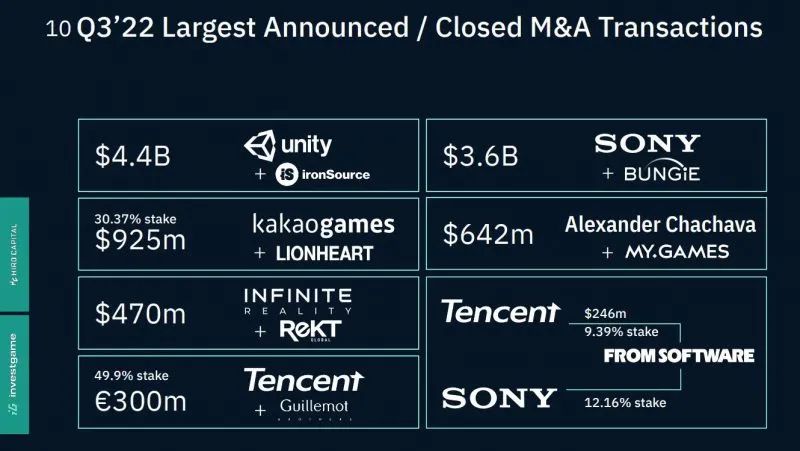 从单季度交易额的角度来看,22年第三季度同比达成了16%的增长,达到67亿美元(21年第三季度为58亿美元)。但与此同时,整体交易数量直降31%,从21年第三季度的80笔交易跌至22年第三季度的55笔交易。此外,2022Q3的最大笔交易(索尼以36亿美元收购Bungie)贡献了54%的收益总额,而去年同期最大的单笔交易(EA以14亿美元收购Playdemic)也不过才贡献24%,因此总体数据并不乐观。