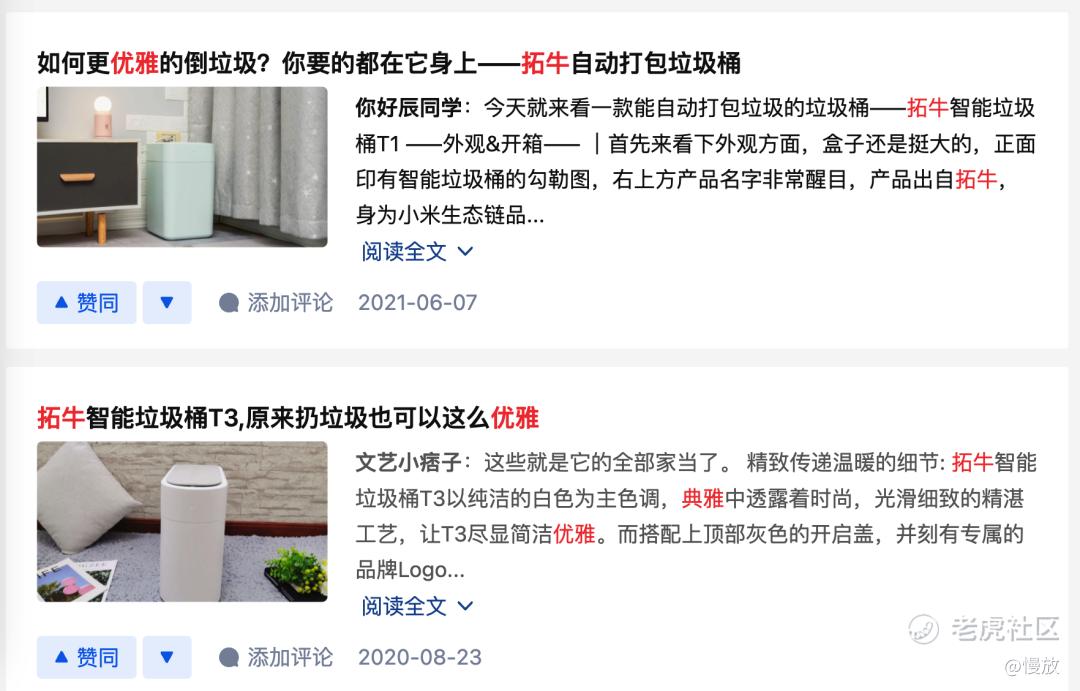 四年过去了,所谓的第三第四代垃圾桶除了形状有微调,功能和 2018 款一模一样,价格却跟初代已经差出三四倍。另一方面,随着销量增长,网上关于拓牛质量问题的投诉也在呈指数增长,百度搜索拓牛,第二三联想词条全部是质量相关。在多个拓牛相关的文章下面,抱怨「垃圾桶盖不上」「自动打包坏了」「电池不耐用」的投诉比比皆是。