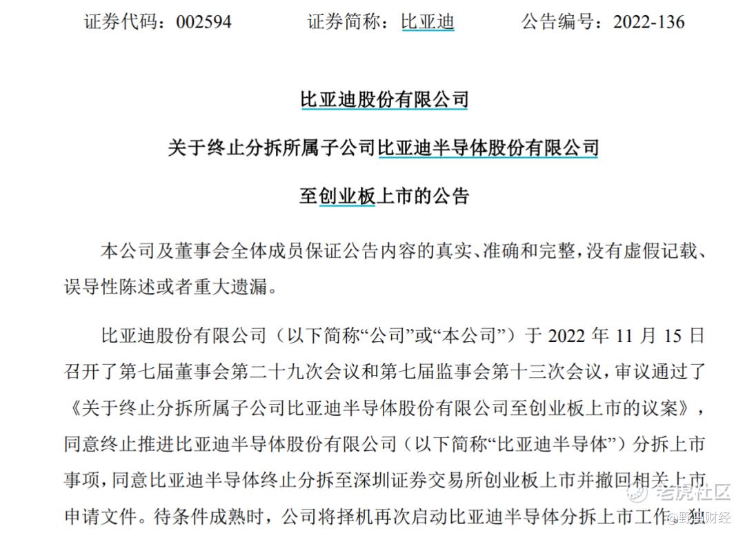 王传福可能低估了拆分上市的难度。2022年11月15日,在IPO进程四度被“中止”后,比亚迪公告了比亚迪半导体主动撤回创业板上市申请的消息。“待条件成熟时,公司将择机再次启动比亚迪半导体拆分上市工作。”