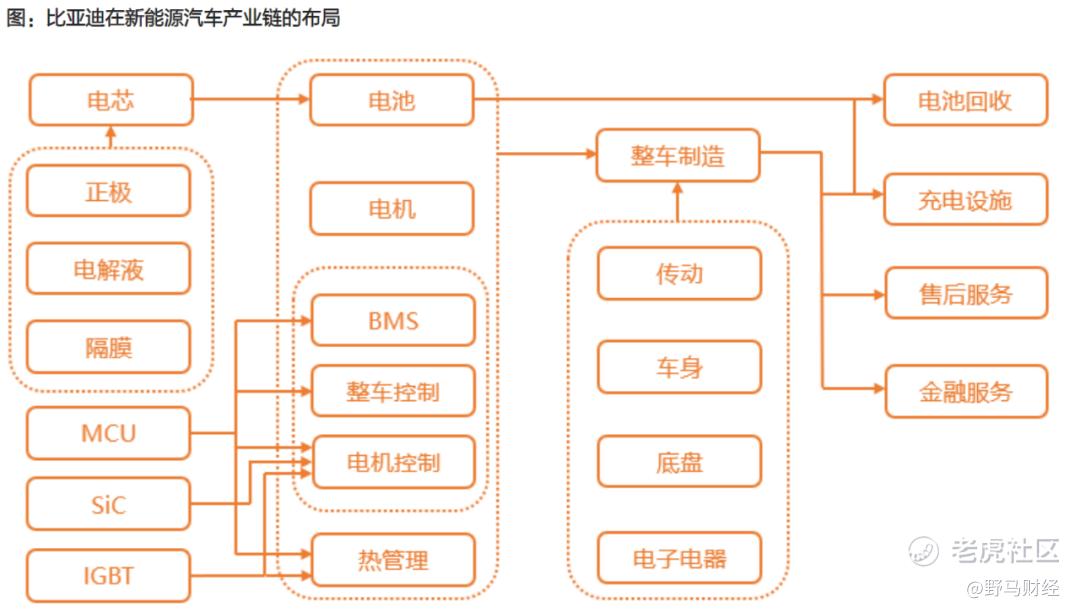 围绕新能源汽车行业,比亚迪已经打造了一条贯穿产业链上、中、下游以及后市场的闭环布局。