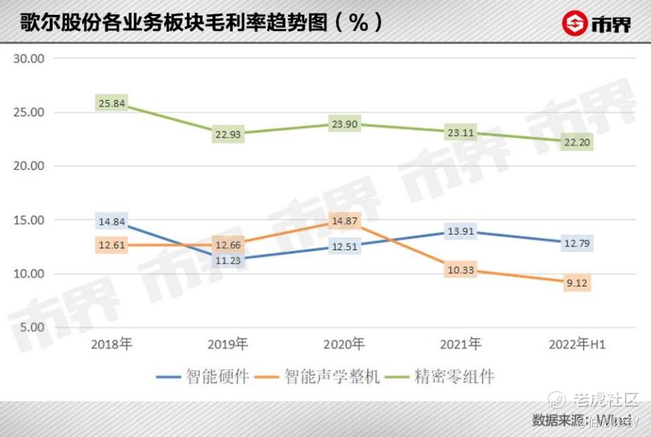 Wind数据显示,歌尔AirPods所属智能声学整机业务板块毛利率从2020年的14.87%下降至今年上半年的9.12%,而歌尔股份的整体毛利率也从2018年的22%以上大幅下滑至2021年的14.13%,当年净利率仅为5.51%。