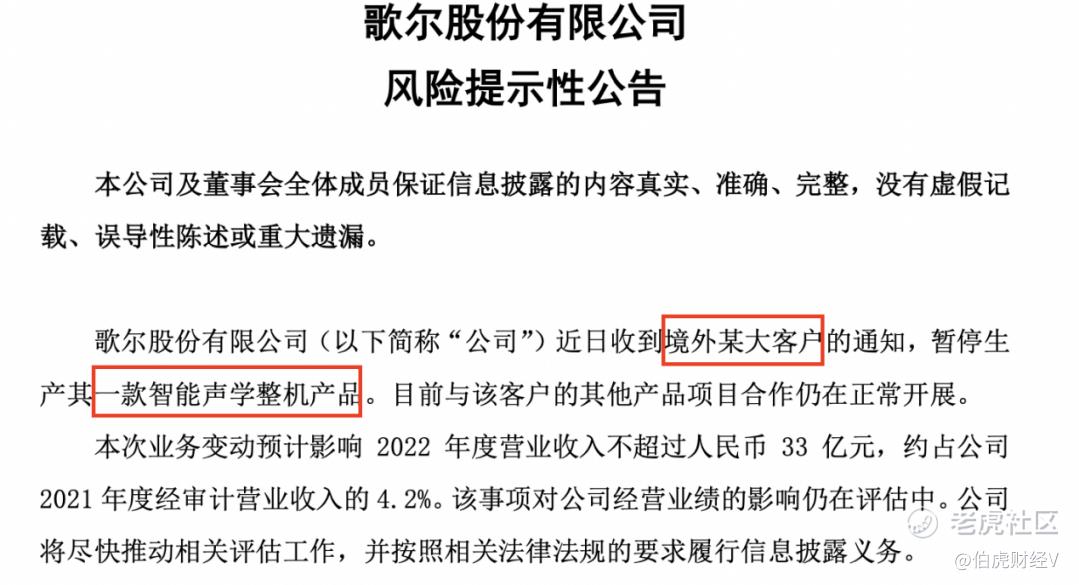 11月8日晚,歌尔股份在深交所发布了一则风险提示性公告,其中的"境外某大客户"、"一款智能声学整机产品"十分耐人寻味。