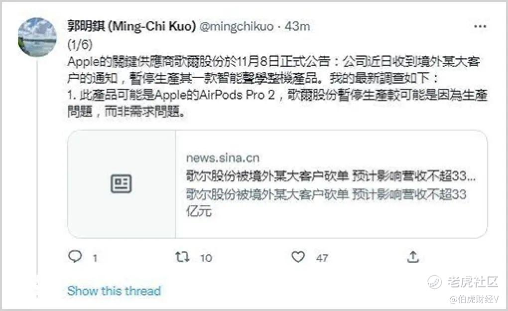 很快,天风国际证券分析师郭明錤调查表示,确认歌尔停产的产品是AirPods Pro 2,并指出另一家供应商立讯精密已经获得了AirPods Pro 2的所有订单,成为该产品的独家组装商。