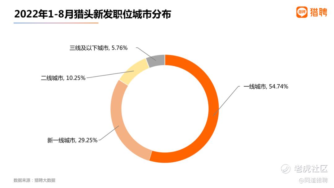 猎头发布的职位在一线城市集中度最高,达到54.74%。一线城市人才需求旺盛、优势企业数量多,企业对猎头服务的支付意愿和支付能力更高,服务需求大于其他城市。