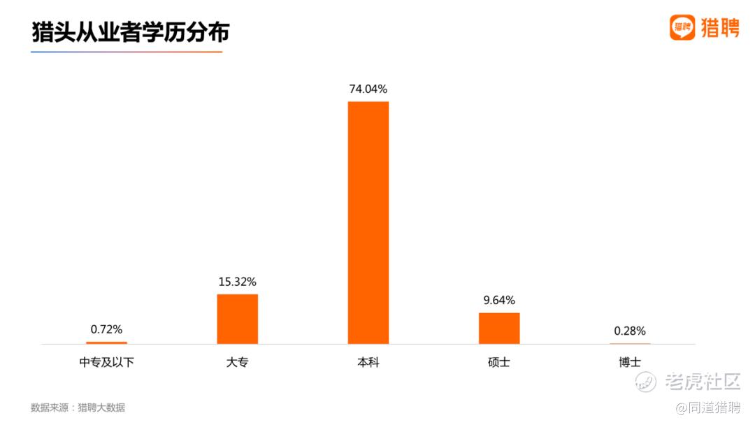 从猎头从业者的学历分布来看,本科学历从业者比例最大,占到总数74.04%;硕士、专科学历从业者各占9.64%、15.32%。博士、中专及以下学历的从业者所占比例较小,占比分别为0.28%、0.72%。总体来说,猎头从业者素质较高,学历结构呈现稳健的纺锤型。