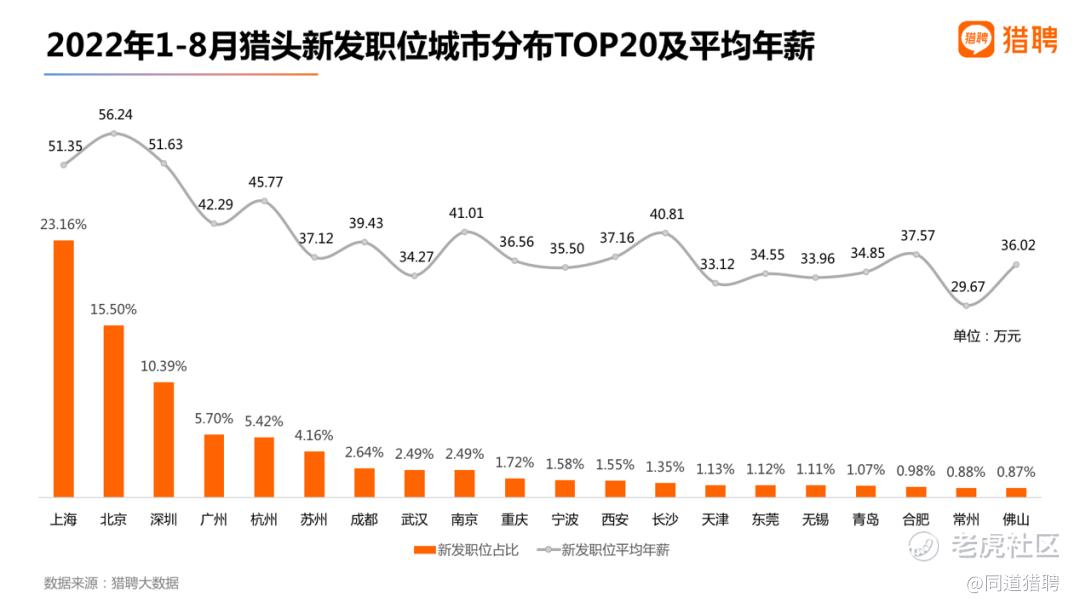 在猎头新发职位平均年薪方面,北京以56.24万元位居首位。深圳、上海、杭州、广州分别以51.63万元、51.35万元、45.77万元、42.29万元排名第二至第五。