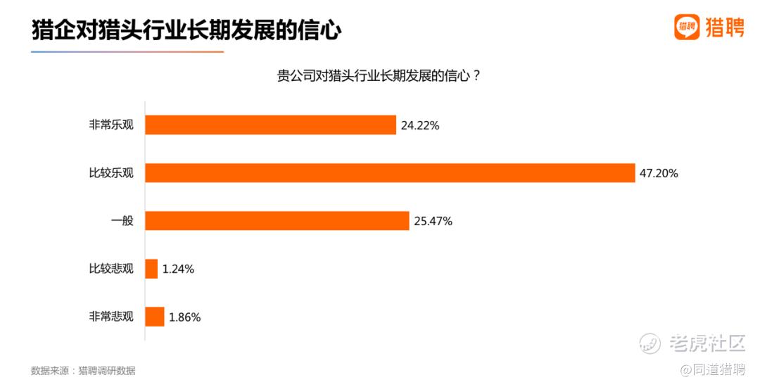 环境会变、挑战会有,但人才的需求和升级是时代的大趋势,猎头行业依然拥有极大的发展潜力。从猎企对行业长期发展的信心来看,超7成猎企表示持乐观态度,仅约3%的猎企持悲观态度,说明大多数猎企对行业长期发展较有信心。