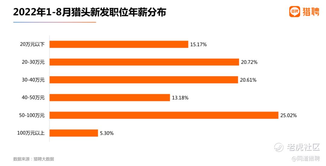 从猎头新发职位的年薪分布可以看出,年薪20-50万元的职位占比较大,合计54.51%。这类职位市场需求大、行业分布广,并且招聘周期较短,是大多数猎头服务的职位。