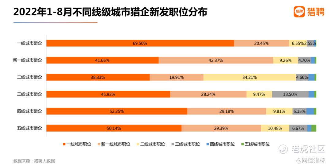 猎企跨区域开展业务,在猎头行业是比较常见的现象,尤其行业线上化发展和新一线及以下城市猎企增加加速了这种业态发展。猎聘大数据显示,不论是哪类线级城市的猎企群体,其发布的职位均涉及不同线级城市,可见猎企的客户来源在区域上具有多元化特征。