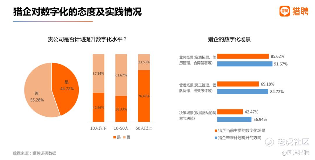 数字技术正在与各行各业发生融合,成为推动行业创新发展的重要驱动力。在猎头行业,数字化、智能化、信息化程度同样在不断加深。当问及是否计划提升数字化水平时,44.72%的猎企给出了肯定的答复。其中,大型猎企(50人以上的猎企)对数字化的关注度最高,有76.47%的猎企计划提升数字化水平。